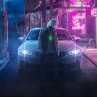 a city street at night. There is a white car in the background, and the setting appears to be an urban alleyway with various