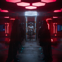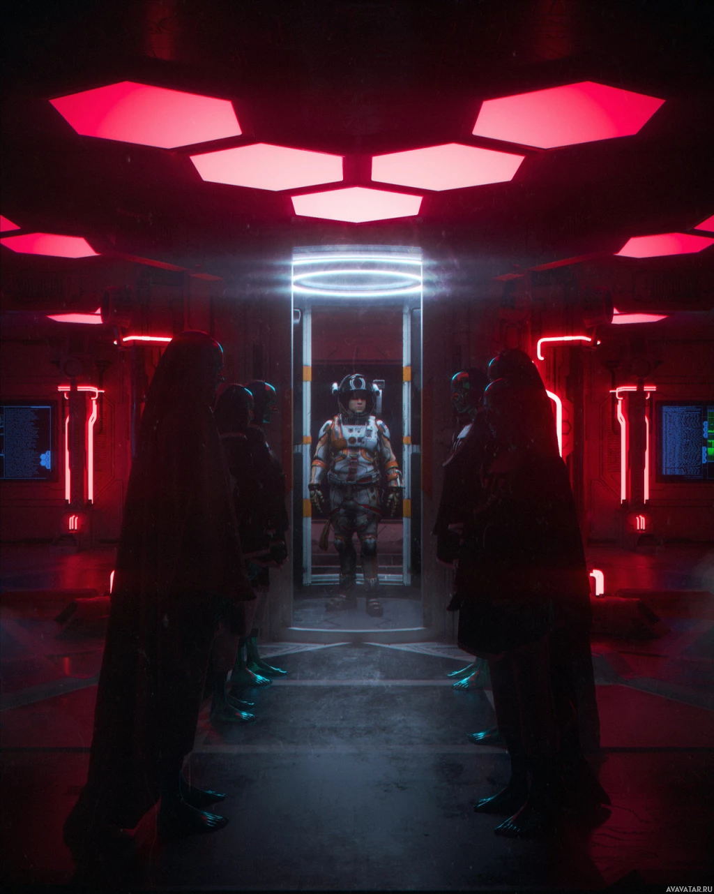 fiction setting. In the center, there is an astronaut wearing a spacesuit, standing between two figures on either side who are also dressed in similar suits with red and blue accents. They are positioned in front of a doorway that has an unusual geometric shape at its peak, illuminated by red lighting that creates