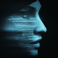 The image features a stylized representation of a person, likely a woman, with her face obscured by what appears to be digital or cybernetic elements. The overall tone is dark and moody, with