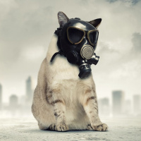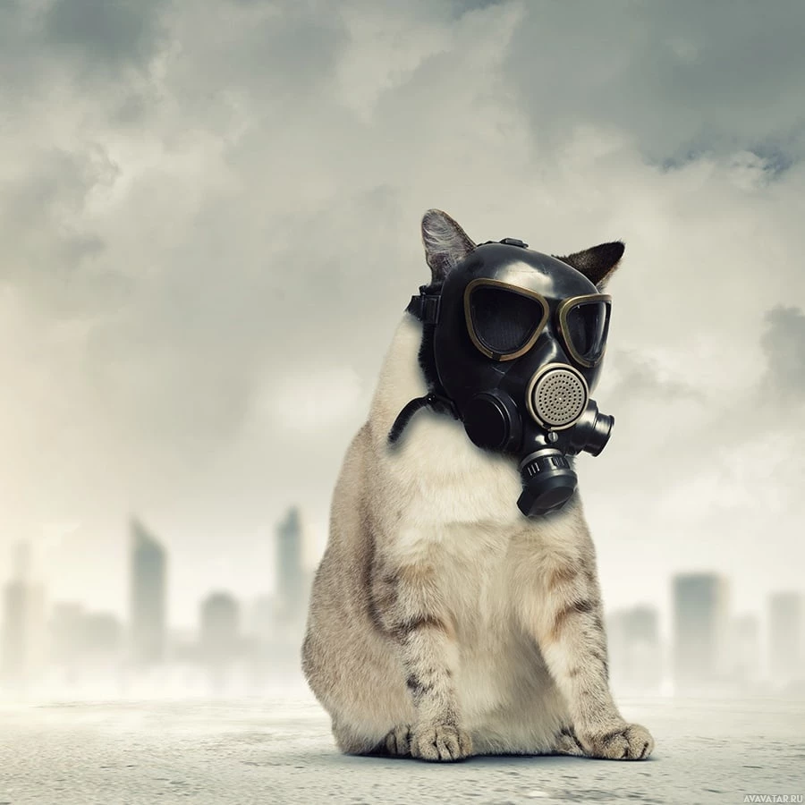 an oxygen mask or respirator. This is not a typical sight as cats do not require oxygen masks for breathing, and the scene might be staged for artistic or humorous purposes. In the background, there is