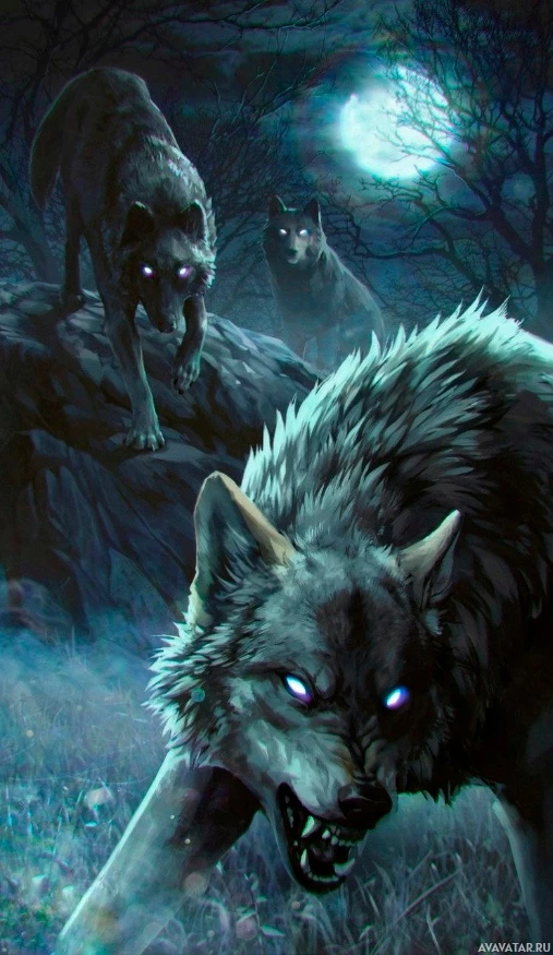 The image depicts a scene with several wolves in what appears to be a dark, possibly