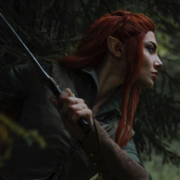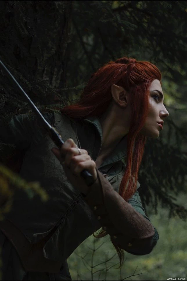 red hair that is styled to look like an elf's. They are holding what appears to be a bow or some