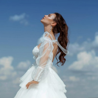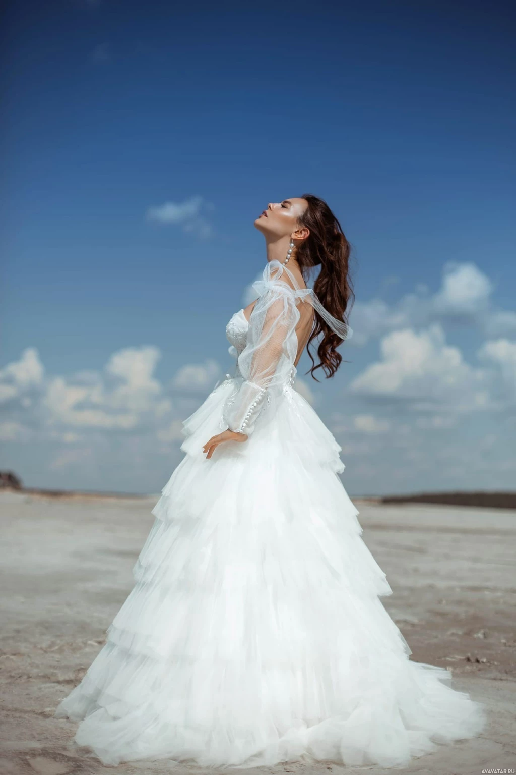 wedding dress with long sleeves and a light color, possibly white or cream. Her posture suggests she might be gazing at something out of the frame. There are no clouds visible in the sky, indicating it may be
