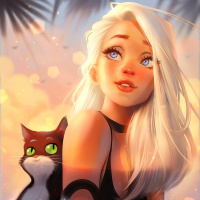 a black top or dress with a high neckline, and her posture suggests she is relaxed. To her right is an illustrated cat with