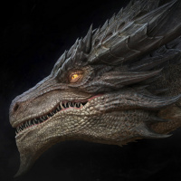 various forms. The dragon has scales that appear to be made of metal or bone-like material, giving it an armored look, and it has a fierce expression with sharp teeth and
