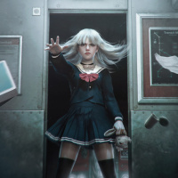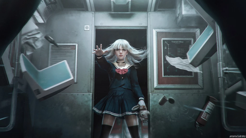 a school uniform and has a serious or intense expression on her face. There's an element of chaos around her as debris, possibly from the train itself, is flying towards her, creating