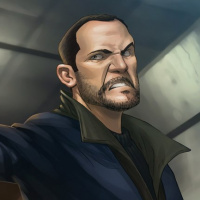 The image depicts a male character holding a gun and pointing it forward. This style of artwork is reminiscent of the Grand Theft Auto (GTA) series, which is well-known for its stylized graphic design in video games. The character's facial expression and body language suggest that he might be in a tense or intense situation.