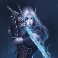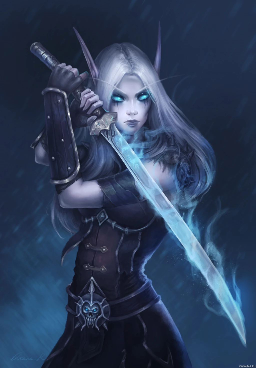 The image features a fantasy-themed character, depicted as an elf. The character is holding a sword and has