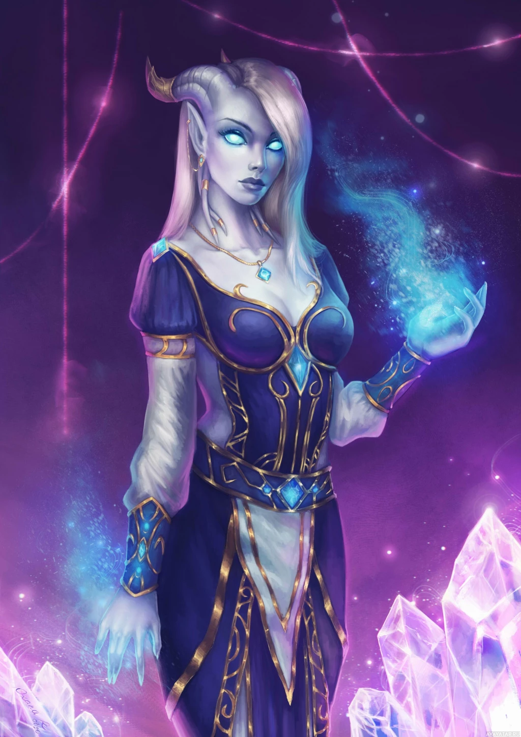 The image features a fantasy character with white hair. She appears to be an elf or similar mythical creature, as indicated by the pointed ears and fantastical elements around her. The character is wearing a dress that seems to be designed for a magical or royal setting, with intricate patterns and details suggesting a connection to arcane magic or royal status within a fantasy universe.