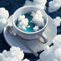 the hot coffee, creating a playful juxtaposition between the warm and the cold elements in the scene. There are also clouds above the water, adding to
