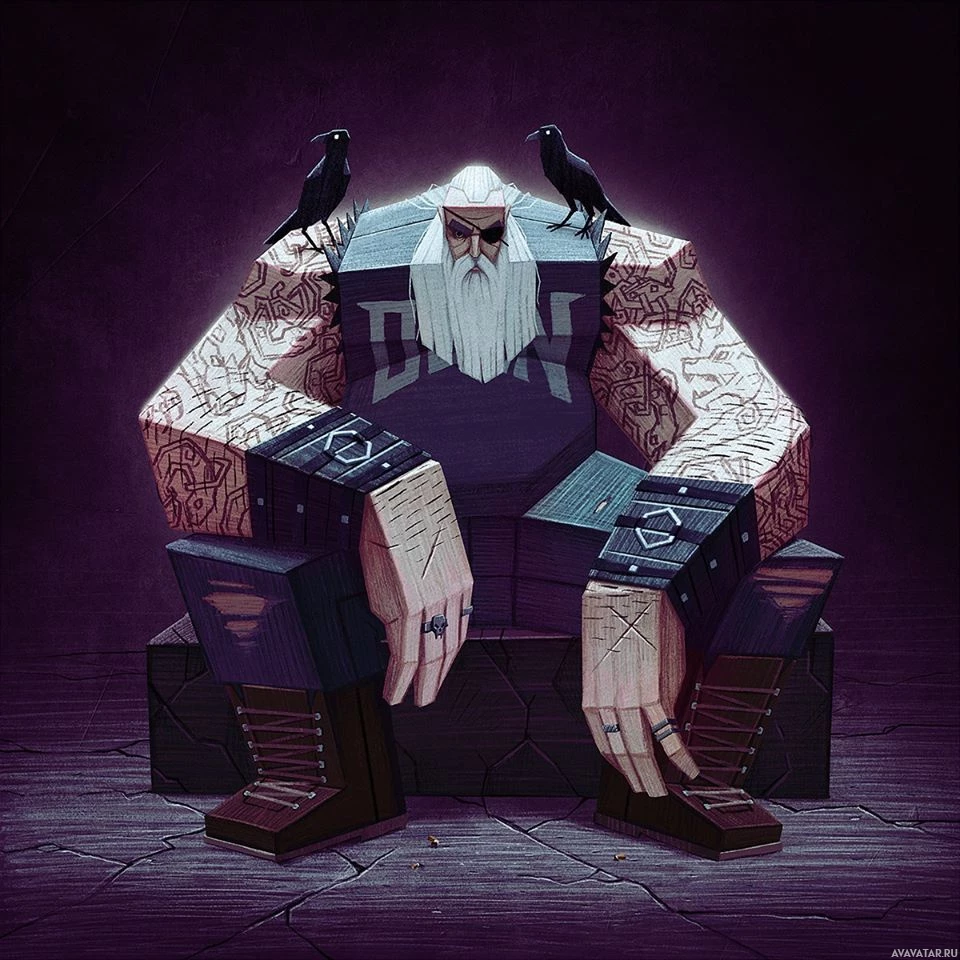white beard, tattoos covering his body, and is wearing a sleeveless outfit that suggests he may be from a non-traditional background or a rebel of sorts. There are birds perched on his shoulders, adding to the mystical or whimsical atmosphere of the image. The character has