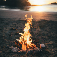 a beach scene at sunset with a fire on the sand. The fire, which is in the center of the image, is burning brightly, creating a warm and inviting atmosphere. It appears to be an intentionally set fire for a gathering or simply for enjoyment by those present. The