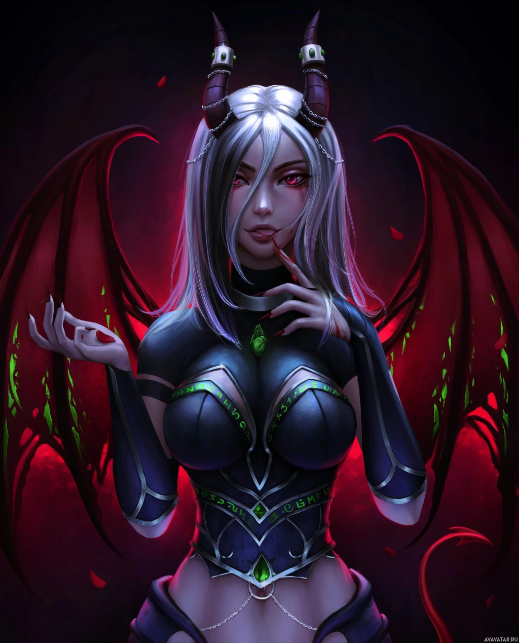 a female character with features commonly associated with fantasy and demonic themes. She has horns, pointed ears, red eyes, and what appears to be a tail, resembling the typical representation of a succubus in various mythologies or modern