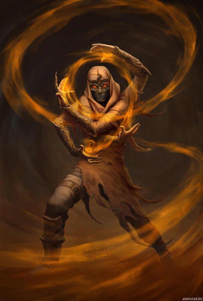 the magical energy that looks like a swirling vortex of yellow and orange flames around their hand. The character's stance is dynamic and intense, indicating action or combat. The setting appears to be a dimly lit environment, possibly underground or in a shadowy location, which contributes to