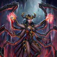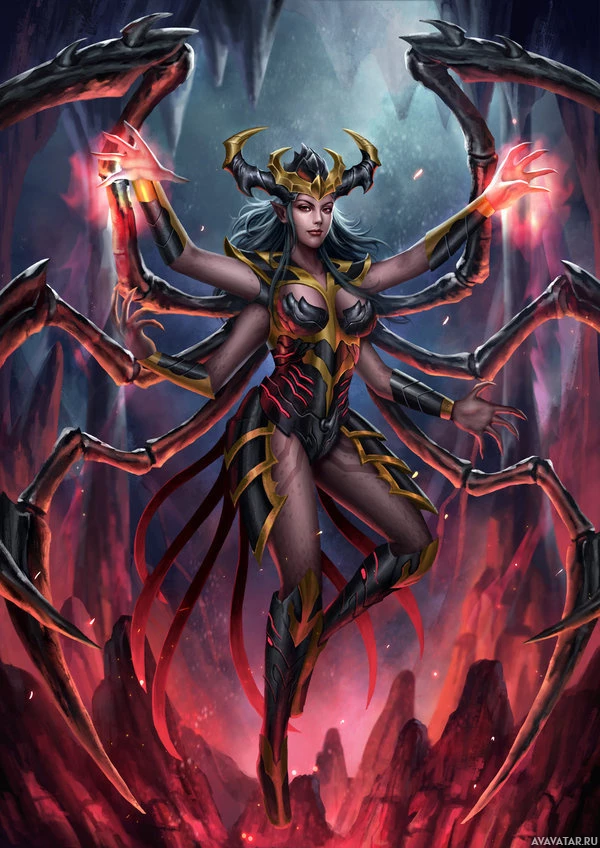 a female warrior or goddess with multiple arms. She is wearing armor and has several spikes protruding from her back. Her attire is intricate and ornate, suggesting a high status or