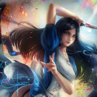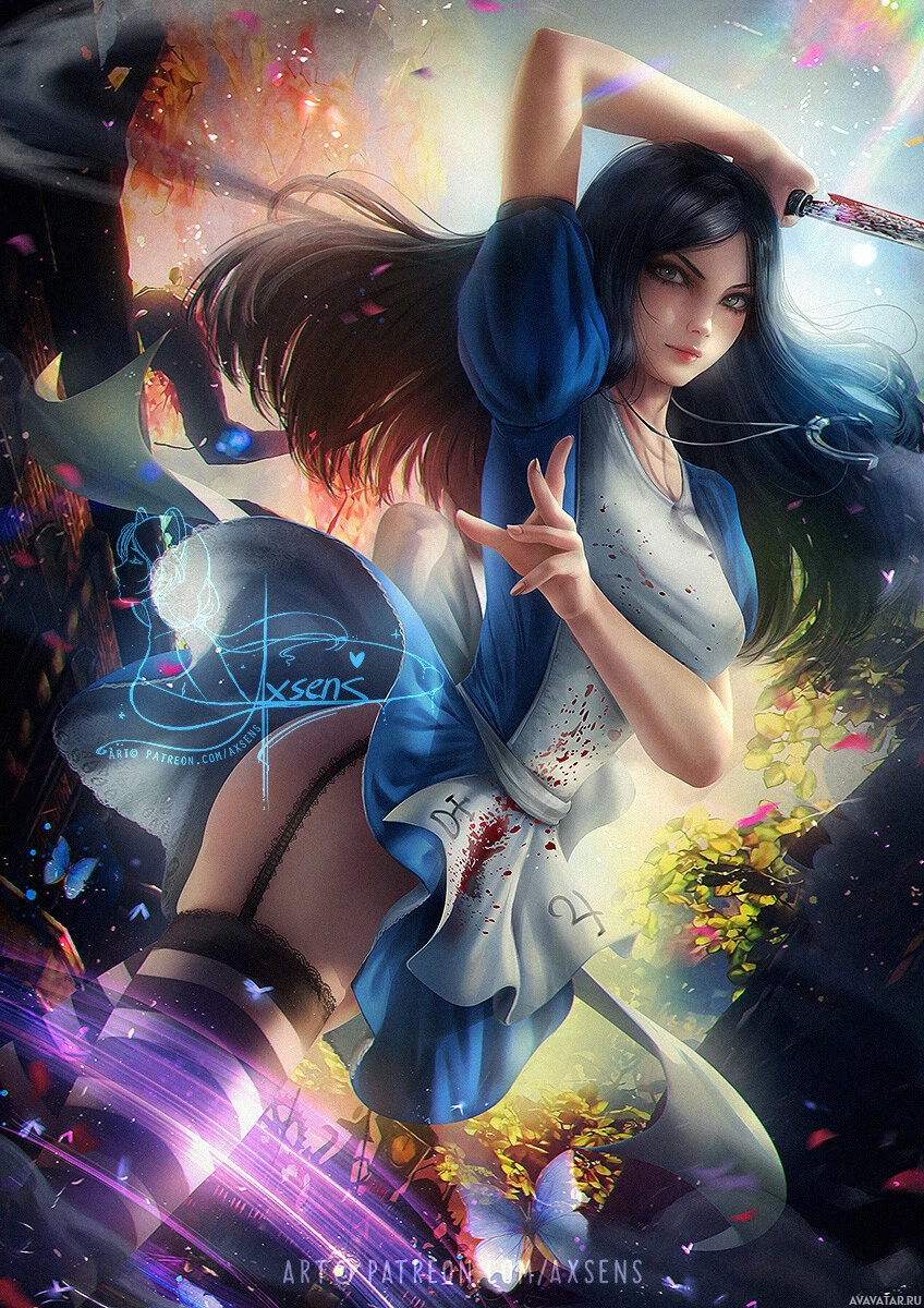 blue hair and is dressed in a costume that resembles the one worn by Alice, complete with a blue dress and a large bow on her head. She holds what seems to be a sword in her right hand, suggesting she may have been through an adventure or battle. The background is colorful and fantastical, fitting for a character from a fantasy-themed story like "