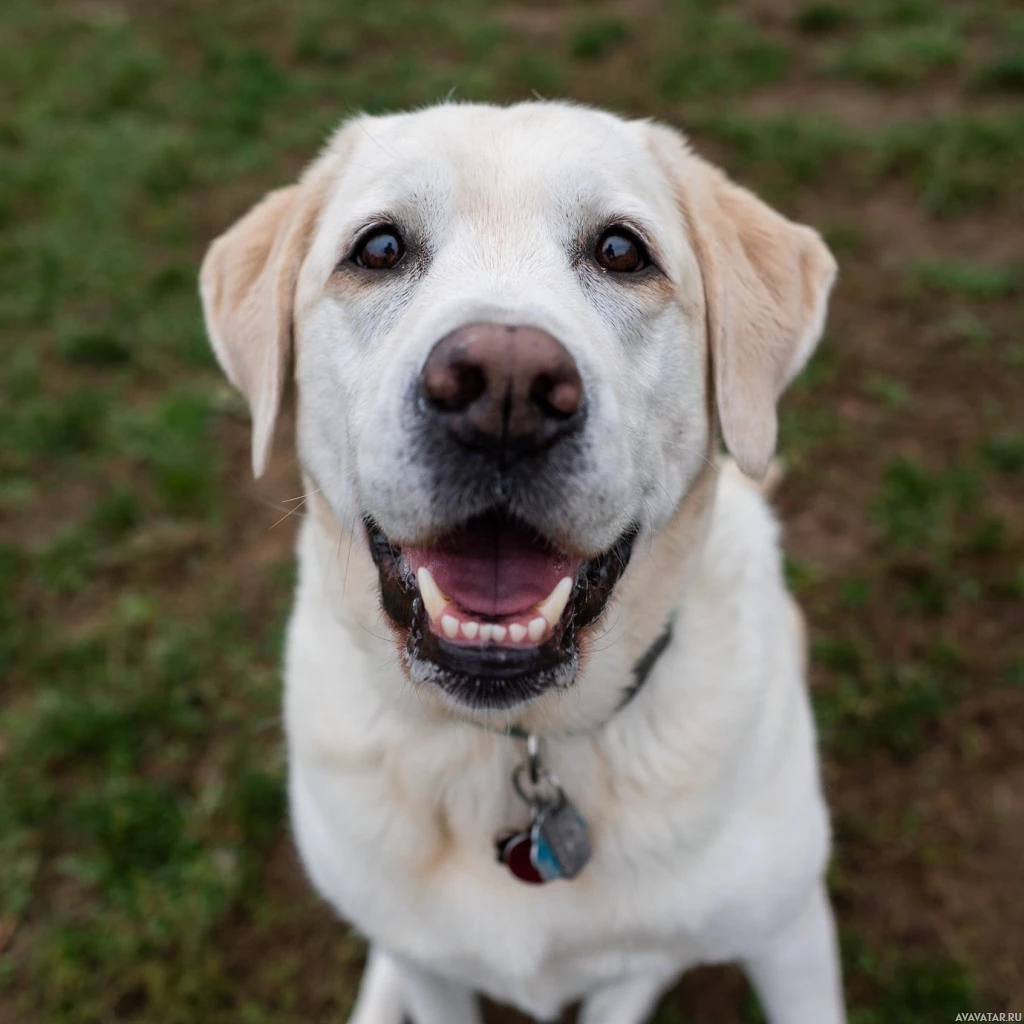 На картинке собака породы лабрадор-ретривер сидит на траве. Собака выглядит счастливой и смотрит прямо в камеру, слегка приоткрыв рот, что может свидетельствовать о том, что она тяжело дышит или просто наслаждается происходящим.