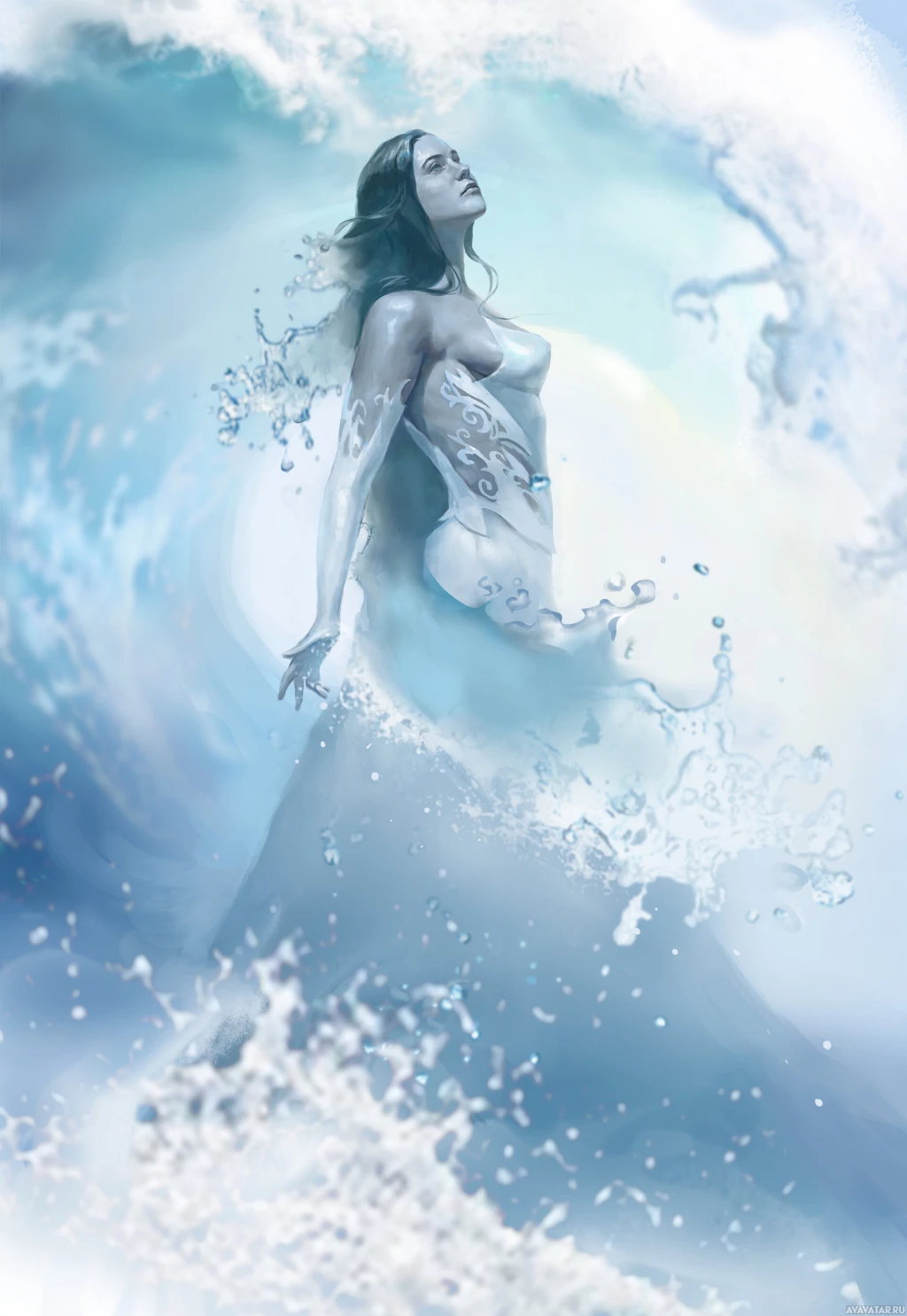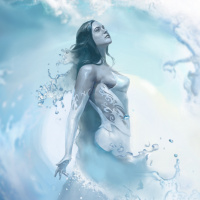 The image features a woman submerged in water, with her upper body visible above the surface. She appears to be embracing the water or perhaps floating, as her arms are outstretched and she seems at peace with her surroundings. The background is painted in shades of blue that suggest