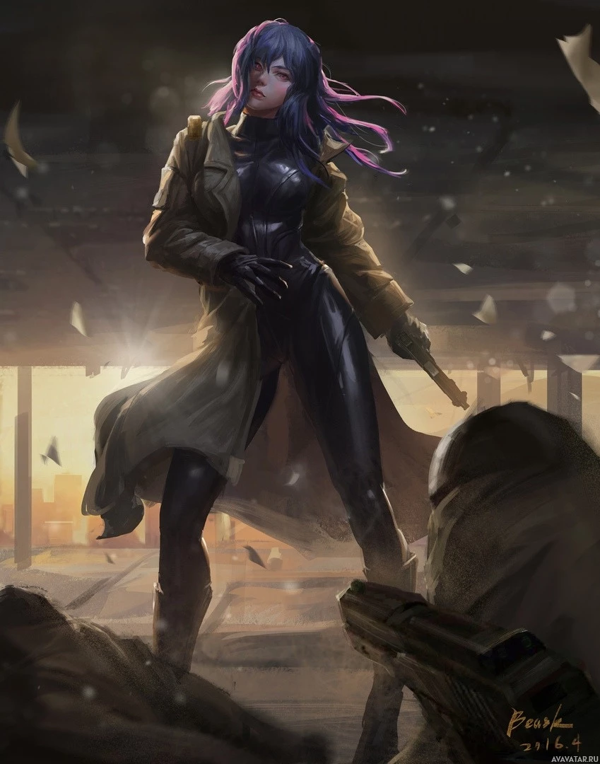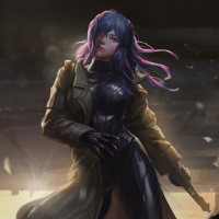 a female character with purple hair, wearing a trench coat and holding a pistol. She stands in