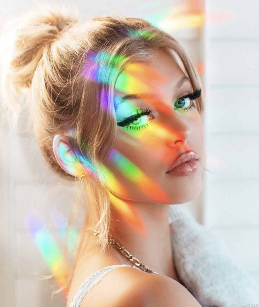 На картинке изображена молодая женщина со светлыми волосами, с макияжем, включающим ярко выраженные синие тени для век. Ее волосы уложены в высокую прическу, и она смотрит в камеру с нейтральным выражением лица. Перед ее лицом красочный световой эффект или радужные пятна, возможно, созданные специальным фильтром или линзой. На заднем плане видна обычная белая стена, что позволяет предположить, что это может быть студийный портрет.