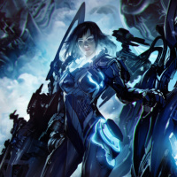 robotic armor, suggesting they might be an astronaut or a warrior in a space-themed setting. The attire includes blue and silver elements that give off a high-