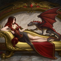 a fantasy scene with a girl, who is lying on an ornate couch with red drapery. She has