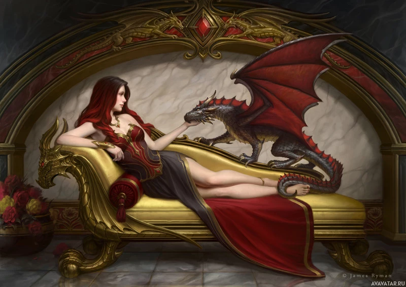 red hair and is dressed in a dress that matches her hair color. A dragon, which appears to be friendly, is perched on