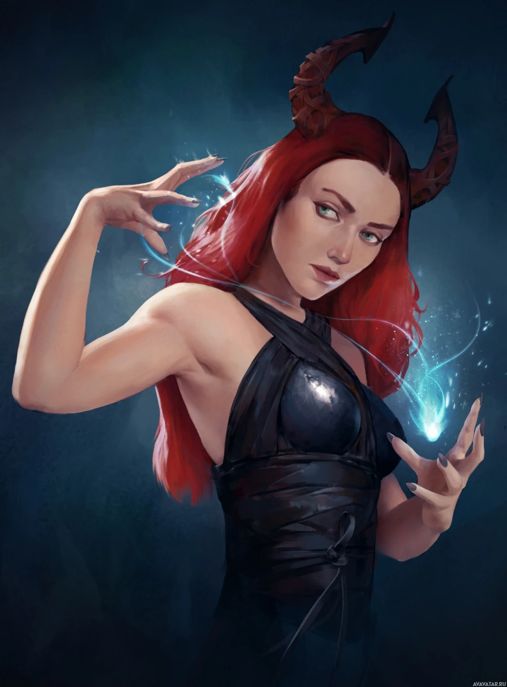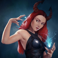 the magical energy emanating from her hand. The background has a mystical or demonic theme, fitting for a character that could represent a witch, sorcerer, or other