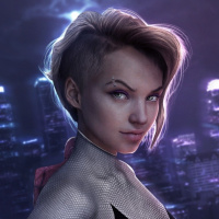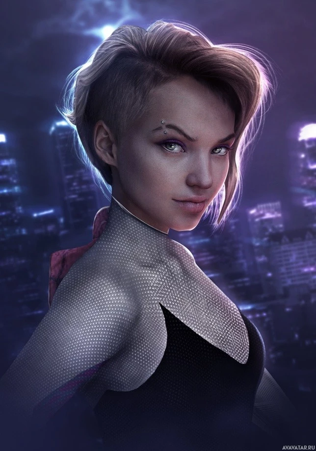 facial expression is serious, and she seems to be looking at the viewer directly. The character is wearing a costume that resembles Spider-Man's suit but with some modifications. The background is dark and moody, with hints of city lights that suggest a nighttime