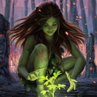 a forest scene with elements of destruction in the background, such as burning trees and cracked earth, suggesting some sort of magical or protective act being performed by the dryad over the new growth.