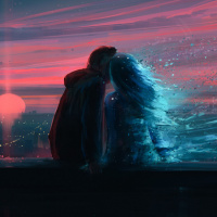 warm hues at the horizon to cooler tones higher up. The figures are embracing each other in