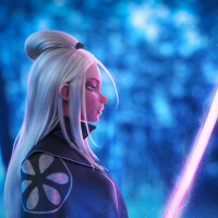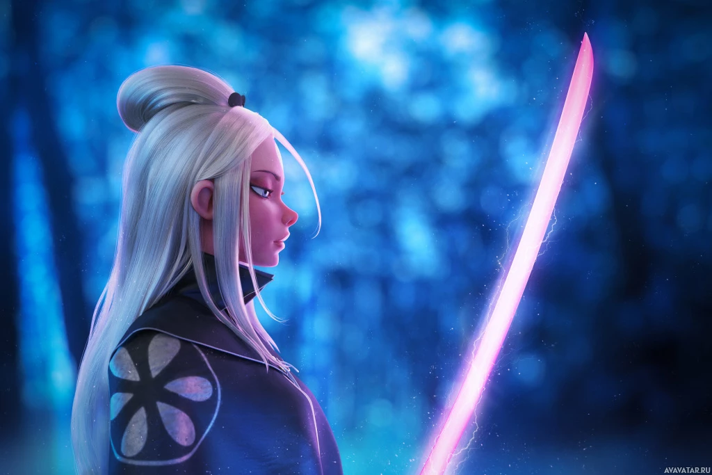 white hair, holding what appears to be a sword or a staff with pink stripes. The character is standing in a setting that looks like it could be