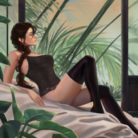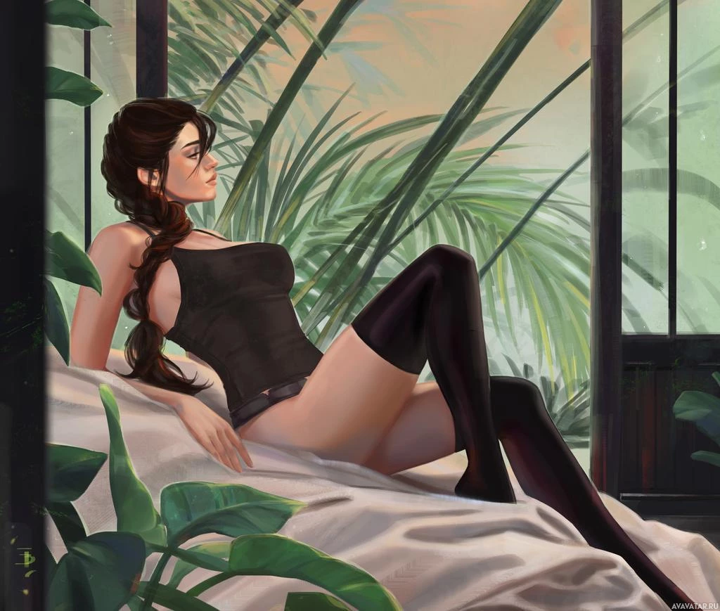 a suggestive pose on what seems to be a couch or bed with a backdrop of tropical plants. Her attire includes lingerie and