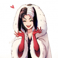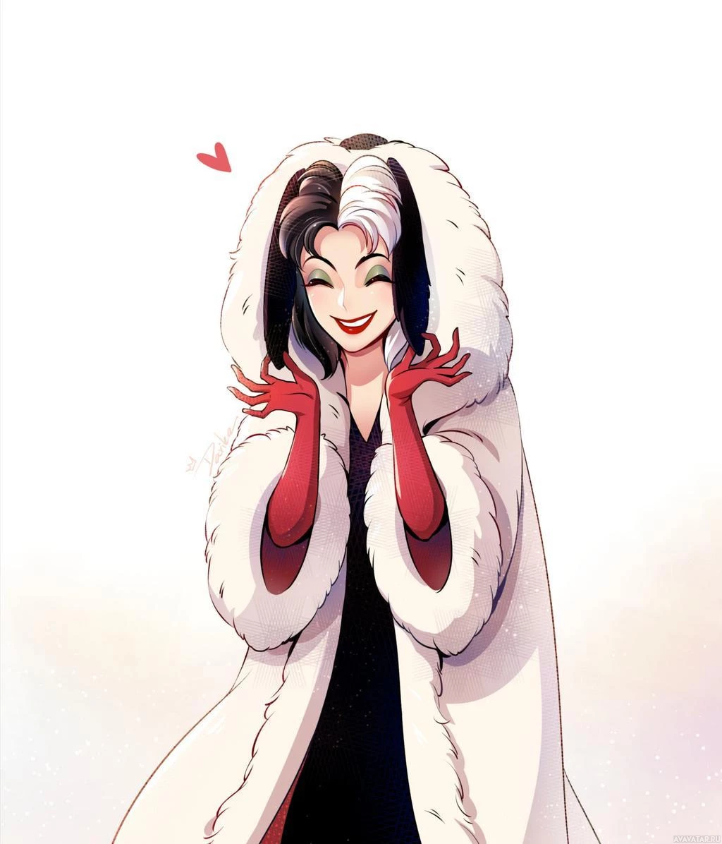 На картинке изображен анимационный персонаж, женщина с закрытыми глазами и широкой улыбкой на лице. На ней меховая шуба и перчатки красного цвета. Персонаж, похоже, из анимационного фильма или сериала.