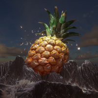 a fantastical scene with a large, glowing pineapple hovering in the sky above a landscape that appears to be set on another planet. Below the pineapple, there is
