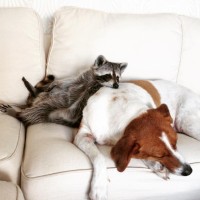 a cozy scene with two animals on a couch. On the left, there is a raccoon lying comfortably with its paws behind it and its eyes closed, as if taking a nap or simply relaxing. On the right side of the couch, there is a dog sleeping peacefully with its head resting on its