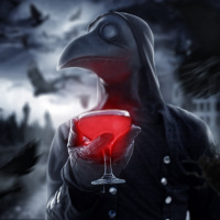 red wine with one hand, and it seems to be set in a dark, eerie environment that might suggest a horror or gothic theme. The overall atmosphere of the image gives