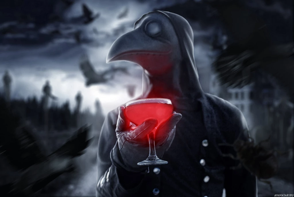 doctor mask, which is a type of bird-beaked mask used in the past as a protective device against the bubonic plague. This character is holding a glass of