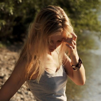 a young woman standing on the edge of a body of water, possibly a lake or a river. She is wearing a grey