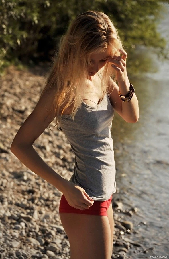 tank top and red shorts. Her left hand is placed on her hip while she gazes away from the camera with her right hand near her eyes, which could suggest a thoughtful or contemplative pose. The setting appears to be in