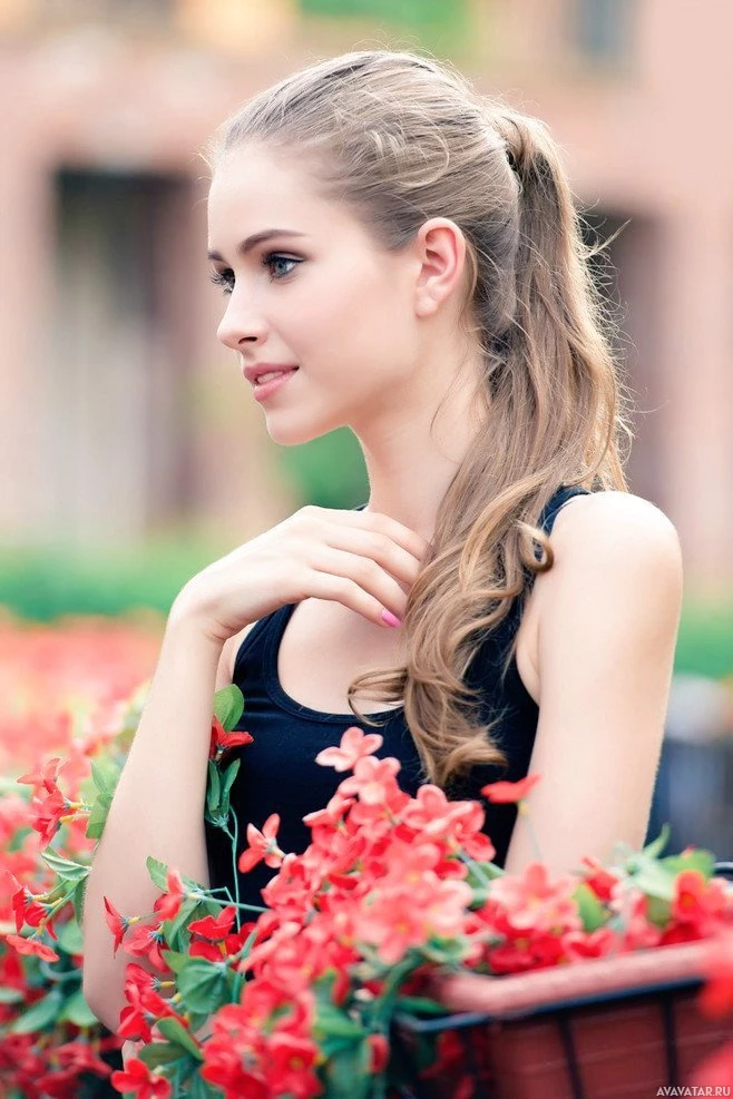 На картинке изображена молодая женщина с длинными волосами, смотрящая в сторону. Кажется, что она находится в саду или парковой зоне, так как поблизости растут красные цветы. Ее взгляд направлен на что-то, чего не видно в кадре.