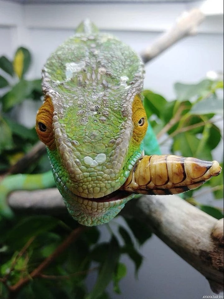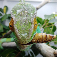 color pattern with shades of green, yellow, and brown, which is characteristic of the species. It's looking towards the camera, and its tongue is extended out, possibly in preparation for catching prey or tasting something in its environment. The background suggests that this chameleon might be in a controlled setting like an enclosure at a zoo or a reptile