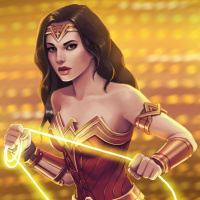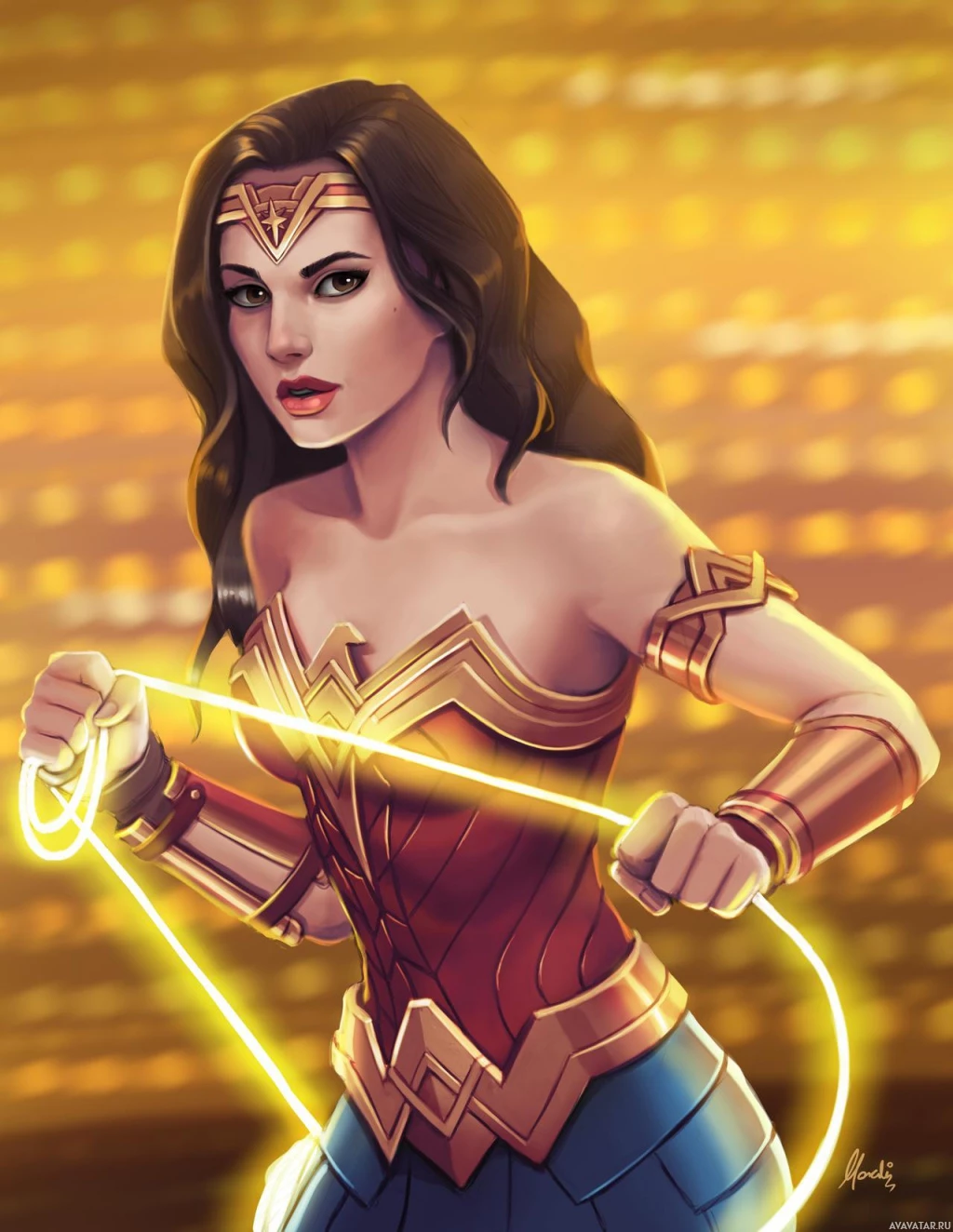 This is an illustration of Wonder Woman, a fictional superhero character from the DC Comics universe. She is depicted with her iconic golden bracelets and lasso in hand, ready to engage in battle or protect the innocent as the Amazonian warrior princess.
