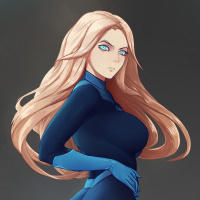 The image shows an illustration of a female character with blonde hair. She appears to be wearing a black suit with blue accents, and her pose suggests confidence or readiness for action. Her expression seems focused or serious.