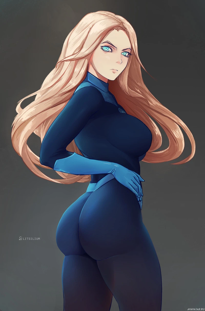 На картинке изображена женщина со светлыми волосами. На ней черный костюм с синими вставками, а ее поза говорит об уверенности или готовности к действию. Выражение ее лица кажется сосредоточенным или серьезным.