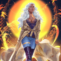 a fantasy story or game. The artwork is detailed and rich in color, emphasizing her presence with