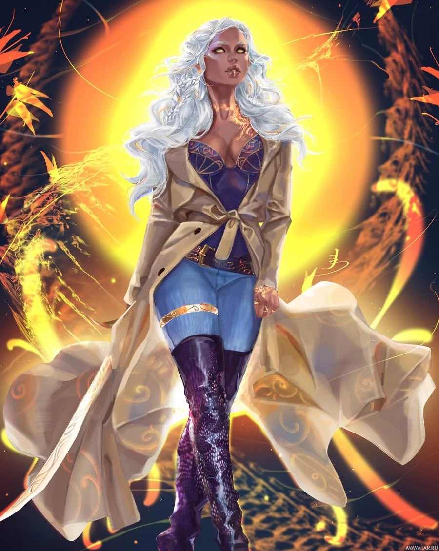 a long coat and boots that give off a mystical or otherworldly vibe. There are elements around her like flames and what seems to be magical energy or magic wielding motifs, suggesting she might be a character from