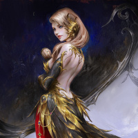 blonde hair, and her attire includes a red bodysuit with wings and feather-like ornaments around it. Additionally, she appears to have some
