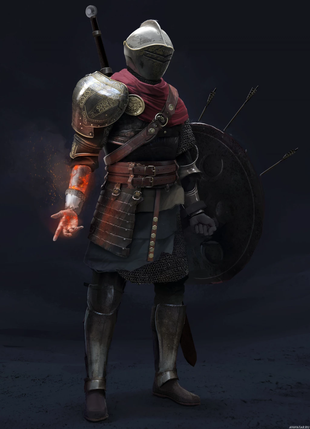 full armor, including a helmet, gauntlets, chest piece, and greaves, which suggests they are prepared for battle. They are also holding a shield in their left hand, ready for combat. The design is detailed, with textures that give the appearance of