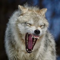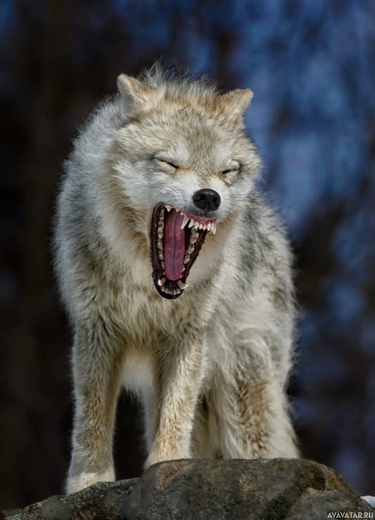 На снимке изображен волк. Это воет или вокал, с открытым ртом и открытыми зубами. Фон кажется естественной наружной обстановкой, возможно, зимой, учитывая деревья без листьев и скалистую землю.